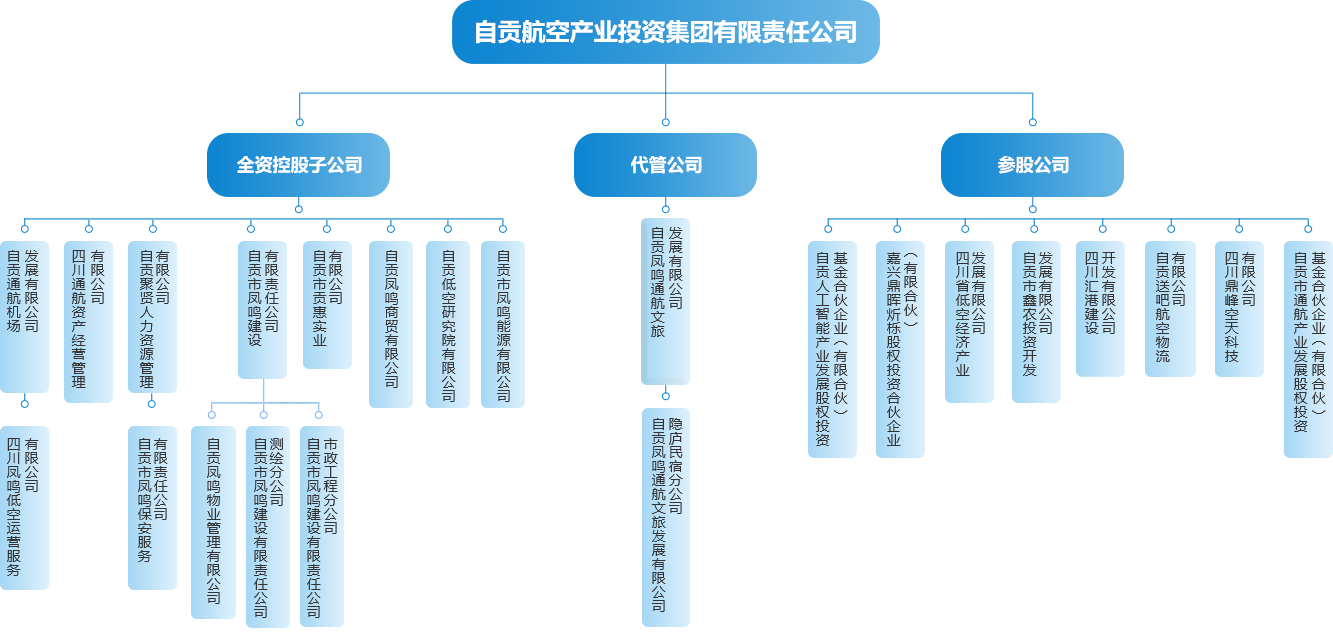 自贡航空产业投资集团有限责任公司(以下简称 自贡航投 )成立于2018年2月,是由自贡航空产业园区管委会出资的国有集团公司。公司位于自贡市贡井区自贡航空产业园内,下辖自贡通航机场发展有限公司、自贡市凤鸣建设有限责任公司、四川通航资产经营管理有限公司、自贡聚贤人力资源管理有限公司、自贡凤鸣商贸有限公司、自贡凤鸣物业管理有限公司、自贡市凤鸣保安服务有限责任公司、四川凤鸣低空运营服务有限公司等11家全资子公司,对外投资企业8家,代管自贡凤鸣通航文旅发展有限公司。