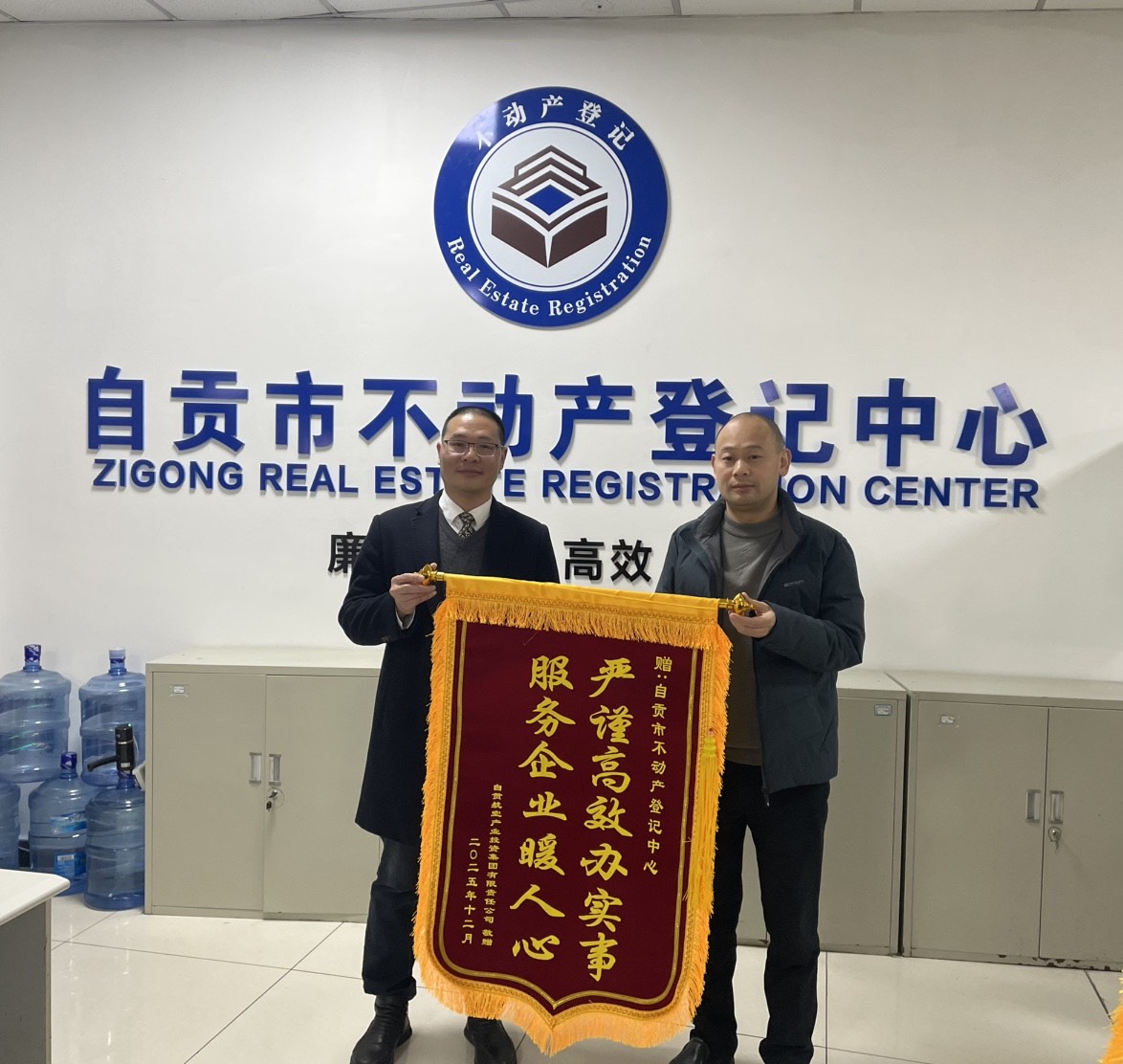 近日,自贡航投集团将印刻着“严谨高效办实事 服务企业暖人心”“登记高效 服务贴心”的锦旗送至自贡市不动产登记中心,以感谢中心在项目产权证办理过程中提供的精准指导与高效服务。